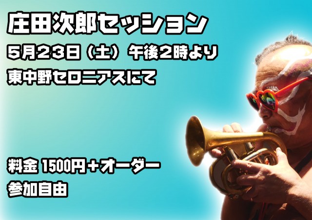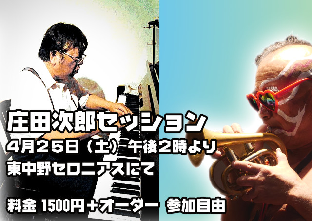 ■ 2026/04/25(Sat) 10:54 【本日】庄田次郎セッション / 庄田次郎(trumpet, alto sax, etc), 木村由(dance), ゲスト 雨宮拓(piano) 東中野セロニアスにて 午後2時より