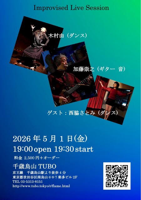 ベテランギタリスト加藤崇之と向き合う即興セッション。今回はゲストにダンサーの西脇さとみさんをお招きします。